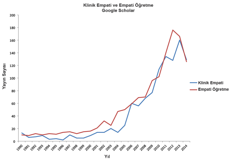 Google Scholar araştırması ile klinik empati ve empati öğretme konuları hakkında 1990 ile 2014 arasında yayımlanmış olan makale sayısı